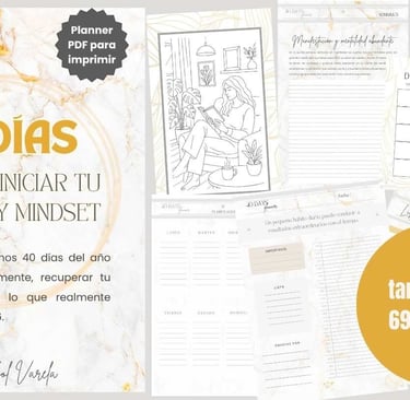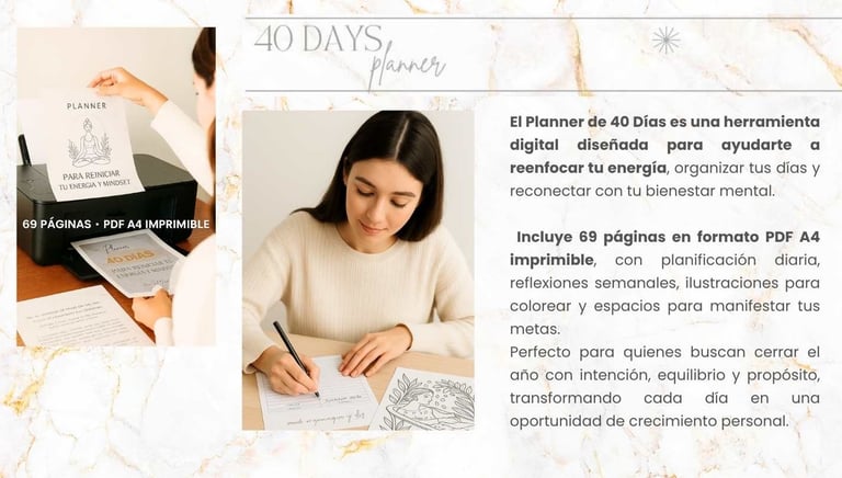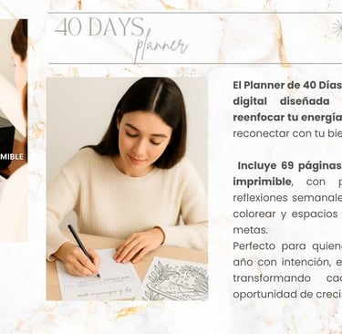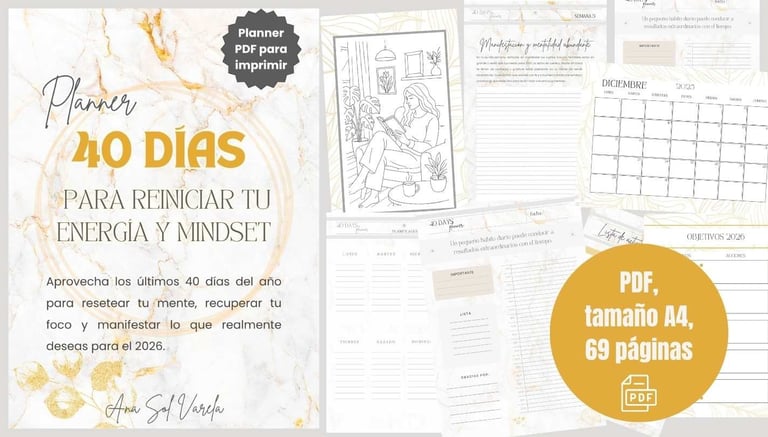 El Planner de 40 Días es una guía práctica y emocional para ayudarte a reenfocarte, recuperar energía y manifestar tus metas antes de comenzar el 2026.